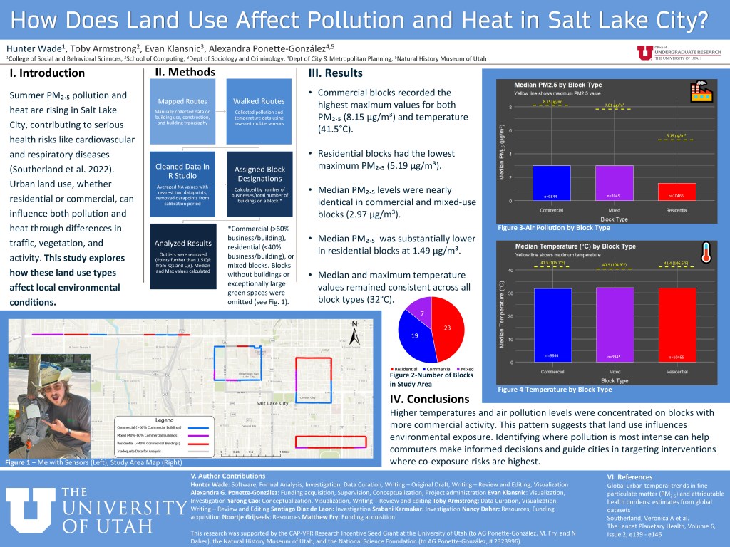 This undergraduate research project, led by Hunter Wade and supported by Evan Klansnic, investigates how different land use types influence both air pollution (PM₂.₅) and temperature in Salt Lake City, contributing to the broader effort to understand how urban environments affect local environmental health conditions.